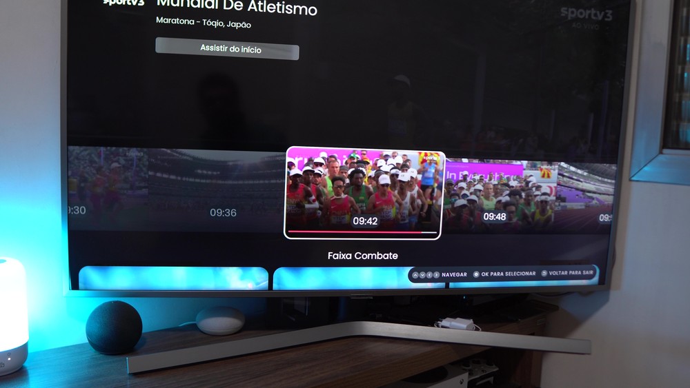 Para cima, é possível retornar até algum momento anterior da atração no ar. No botão de baixo, aparece uma barra superior com o acesso a todos os recursos fornecidos pela operadora aos assinantes.